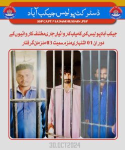 جیکب آباد پولیس کی مختلف کاروائیاں، مقابلے اور چھاپوں کے دوران 19 ملزمان کو گرفتار کرنے کا دعویٰ۔ تفصیلات کے مطابق جیکب آباد پولیس کے ترجمان کے مطابق پولیس نے ضلع کے مختلف علاقوں میں پولیس مقابلوں اور چھاپوں کے دوران 19 ملزمان کو گرفتار کرکے اسلحہ برآمد کرلیا ہے۔ جیکب آباد کی تحصیل ٹھل کے بی سیکشن تھانہ کی حدود میں پولیس اور ڈاکوؤں کے درمیان مقابلہ ہوا جس کے نتیجے میں بلوچستان کے علاقے ڈیرہ اللہ یار کے رہائشی مہتاب بھٹی کو زخمی حالت میں جبکہ اس کے دوسرے ساتھی سمیر مندرانی کو گرفتار کرکے اسلحہ برآمد کیا گیا ہے، زخمی ملزم کو علاج کے لیے اسپتال منتقل کیا گیا ہے۔ علاوہ ازیں ٹھل کے اے سیکشن تھانہ کی پولیس نے چیکنگ کے دوران ایک اشتہاری ملزم عباس علی برڑو کو گرفتار کرلیا، ایک اور کاروائی میں تھانہ میرانپور کی پولیس نے ایک ملزم عبدالخلیل کٹوہر کو گرفتار کرکے ٹی ٹی پسٹل برآمد کرلی، تھانہ دوداپور کی پولیس نے بھی چیکنگ کے دوران ایک ملزم ہدایت اللہ کٹویر کو گرفتار کرکے ٹی ٹی پسٹل برآمد کی، دریں اثناء سی آئی اے پولیس نے تھانہ تاجو دیرو کی حدود میں بدنام زمانہ ملزم مقیم ملغانی کے جوا کے اڈے پر چھاپہ مارا تو ملزمان نے پولیس کو دیکھ کر فائرنگ کرکے جس کے بعد پولیس نے 14 ملزمان کریم بخش، بابل دیناری، سہراب قمبرانی، منصب جکھرانی، محمد قاسم قمبرانی، دیدار سنانی، غلام یاسین، مور خان، حاکم میرالی، رحمت اللہ بلیدی، قربان میرالی، صدام حسین ملغانی، شہمیر دیناری، غلام سرور بلیدی کو گرفتار کرلیا، گرفتار ملزمان کے قبضے سے 3 ٹی ٹی پسٹل بھی برآمد کئے گئے۔