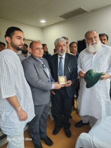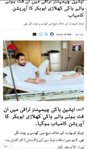 عیادت کی اور ہاکی فیڈریشن کے کنسلٹنٹ سرجن پروفیسر کامران بٹ سے بھی ملاقات کی اور ابوبکر کی صحت کے بارے میں تفصیل سے اظہار خیال کیا اس موقع پر ہاکی فیڈریشن کے عہدیدران نے پروفیسر کامران بٹ کی ہاکی فیڈریشن کے لیے دی گئیں خدمات پر انہیں اعزازی کیپ اور آ فیشل شرٹ سے نوازہ،ان کا کہنا تھا کہ پروفیسر کامران بٹ کی نگرانی میں ہوئی سرجری کے بعد پاکستانی ٹیم کے نائب کپتان جلد فیلڈ میں پریکٹس کرتے نظر آ ئیں گے،دوسری جانب ہاکی فیڈریشن کی جانب سے اعزازی کیپ اور شرٹ ملنے پر پروفیسر کامران بٹ نے اسے اپنے لیے ہاکی فیڈریشن کی جانب سے تحفہ قرار دیا،ان کا کہنا تھا کہ وہ پاکستانی ٹیم کی فٹنس کے حوالے سے ہمیشہ اپنا کردار ادا کرتے نظر آئیں گے ۔