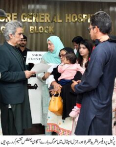 پروفیسر الفرید ظفر نے مریضوں و اُن کے لواحقین سے گفتگو کرتے ہوئے کہا کہ پنجاب حکومت سموگ کے مسئلے پر قابو پانے کے لئے سنجیدگی سے بھرپور اقدامات کر رہی ہے،اس تناظر میں ہیلتھ پروفیشنلز کی یہ ذمہ داری ہے کہ وہ ہسپتالوں اور نجی کلینکس پر علاج معالجے کے لئے آنے والے افراد کو سموگ سے محفوظ رہنے کے لئے احتیاطی تدابیر بارے مکمل آگاہی فراہم کریں تاکہ شہری اپنی صحت کی حفاظت کے لئے طبی ماہرین کے مشورے پر عمل کریں۔ انہوں نے کہا کہ سموگ نظام تنفس، آنکھوں کی جلن، دمہ اور امراض قلب میں مبتلا مریضوں کیلئے زیادہ مہلک ثابت ہو سکتی ہے اور ایسے افراد جن کی قوت مدافعت کمزور ہے انہیں خصوصی احتیاط برتنے کی ضرورت ہے۔