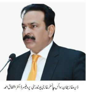 ڈیرہ غازیخان ( ):پروفیسر ڈاکٹر اشفاق احمد کو غازی یونیورسٹی ڈیرہ غازی خان کے وائس چانسلر کے عہدہ پر فائز کردیا گیا ہے۔ وہ موسمیاتی تبدیلی کے شعبے میں بین الاقوامی شہرت کے حامل سائنسدان ہیں۔ وہ زرعی یونیورسٹی فیصل آباد کے شعبہ ایگرانومی کے چیئر مین رہ چکے ہیں ان کی بطور وائس چانسلر تعیناتی سے غازی یونیورسٹی بہت جلد ترقی کی راہ پر گامزن ہوجائے گی.
