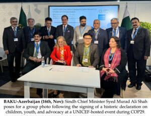 باکو -آذربائیجان (16 نومبر): وزیراعلیٰ سندھ سید مراد علی شاہ نے کہا کہ بچے اور نوجوان نہ صرف موسمیاتی تبدیلیوں کے اثرات سے سب سے زیادہ متاثر ہوئے ہیں بلکہ ایک پائیدار مستقبل بنانے میں ہمارے سب سے بڑے اتحادی بھی ہیں۔ یہ بات انہوں نے اقوام متحدہ کی موسمیاتی تبدیلی کانفرنس (COP29) سے خطاب کرتے ہوئے کہی۔ اپنی پہلی سرکاری دورے کے دوران وزیر اعلیٰ نے پاکستان پویلین میں یونیسیف کے زیر اہتمام ایک تقریب میں شرکت کی جہاں انہوں نے ایک اہم اعلان پر دستخط کیے جس میں بچوں، نوجوانوں اور موسمیاتی کارروائی پر توجہ مرکوز کی گئی۔ یہ اقدام مستقبل کی نسلوں کو ترجیح دینے والی موسمیاتی سمارٹ پالیسیوں کے نفاذ کے لیے سندھ حکومت کے عزم پر توجہ مرکوز کرتا ہے۔ تقریب سے خطاب کرتے ہوئے مراد شاہ نے کہا کہ بچے اور نوجوان نہ صرف موسمیاتی تبدیلیوں کے اثرات سے سب سے زیادہ متاثر ہوتے ہیں بلکہ ایک پائیدار مستقبل کی تعمیر میں ہمارے سب سے بڑے اتحادی بھی ہیں۔ انہوں نے اس بات پر زور دیا کہ سندھ بچوں پر مبنی موسمیاتی حکمت عملیوں کے ذریعے قابو پانے والی صلاحیت کیلئے کوشاں ہے۔ اعلامیہ کے مطابق وعدوں کا خاکہ درج ذیل ہے: آب و ہوا کیلئے مضبوط تعلیمی نظام تیار کرنا۔ آب و ہوا کے حل کیلئے نوجوانوں کی قیادت میں ایڈوکیسی اور اختراع میں سرمایہ کاری۔ بچوں اور خاندانوں پر توجہ مرکوز کرنے والے آفات کی تیاری اور بحالی کے اقدامات کو فروغ دینا۔ وزیراعلیٰ سندھ نے کہا کہ سندھ کو حالیہ برسوں میں اہم موسمیاتی چیلنجز کا سامنا کرنا پڑا جن میں تباہ کن سیلاب اور بڑھتا ہوا درجہ حرارت شامل ہے۔ نتیجتاً موسمیاتی تبدیلیوں سے نمٹنے کیلیے پاکستان سب سے آگے ہے۔ انہوں نے کہا سندھ حکومت اپنے موسمیاتی ایجنڈے میں گرین انرجی کے حل، پائیدار زرعی طریقوں اور نوجوانوں پر توجہ مرکوز کرنے والی صلاحیت سازی کو شامل کرنے کیلئے عمل پیرا ہے۔ وزیراعلیٰ نے کہا کہ COP29 ایونٹ نے انہیں سندھ حکومت کی کامیابی کو اجاگر کرنے کیلئے ایک پلیٹ فارم فراہم کیا ہے جیسے کہ کمیونٹی پر مبنی موافقت کے منصوبے اور بین الاقوامی تنظیموں کے ساتھ شراکت داری جس کا مقصد موسمیاتی تبدیلیوں پر قابو پانے میں اضافہ کرنا ہے۔ سی او پی 29 میں سندھ کی شرکت عالمی ماحولیاتی اہداف کے لیے پاکستان کے عزم کی نشاندہی کرتی ہے اور انسانی ترقی کی ترجیحات کے ساتھ موسمیاتی لچک کو مربوط کرنے میں صوبے کی حکومت کو اجاگر کرتی ہے۔