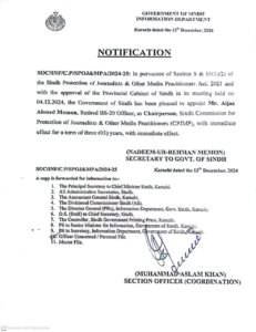 سندھ کابینہ کی منظوری کے بعد سابق (ریٹائرڈ) صوبائی سیکرٹری اعجاز احمد میمن صحافی تنظیموں اور دوسرے میڈیا پریکٹیشنرز کے تحفظ کی کمیشن کے 3 سالوں کے لئے چیئرپرسن مقرر۔