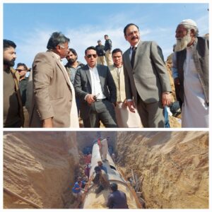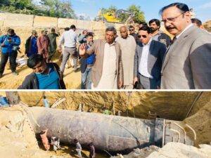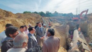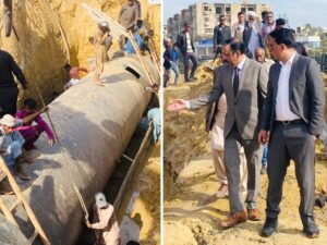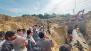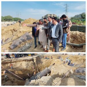 سی ای او واٹر کارپوریشن انجینئر سید صلاح الدین احمد اور سی او او واٹر کارپوریشن انجینئر اسداللہ خان یونیورسٹی روڈ پر پانی کی 84 انچ ڈایا لائن کے مرمتی کام کا جائزہ لے رہے ہیں۔