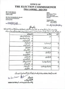 پی ایم اے لاہور کے آئین کے آرٹیکل 18 کلاز (ii) کے تحت جاری کردہ الیکشن شیڈول کے مطابق کاغذات نامزدگی جمع کروانے کی آخری تاریخ 16 دسمبر 2024 تھی۔کاغذات نامزدگی کی جانچ پڑتال اور اعتراضات موصول ہونے کے بعد مندرجہ ذیل امیدواران کے کاغذات نامزدگی درست قرار دیئے گئے۔پی ایم اے الیکشن کے لیے صدارت کے لیے 3امیدوارں پروفیسر ڈاکٹر محمداشرف نظامی، پروفیسر ڈاکٹر شاہد شوکت ملک، ڈاکٹر خواجہ خورشید احمد,نائب صدر ڈاکٹر احمد نعیم اختر, ڈاکٹر رابا سہیل نون نائب صدر (خاتون)،ڈاکٹر بشریٰ حق، ڈاکٹر کوکب سلطانہ ،جنرل سیکریٹری ڈاکٹر واجدعلی، ڈاکٹر محمد فہیم چوہدری،فنانس سیکریٹری ڈاکٹر ارم شہزادی،ڈاکٹر یاسمین احسان،جوائنٹ سیکریٹری (مرد) ڈاکٹر سلمان حیدر کاظمی،ڈاکٹر عارف تبسم
