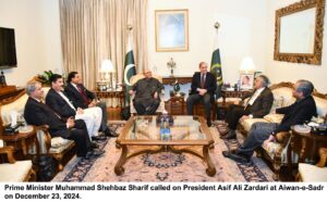 اسلام آباد۔23دسمبر :صدر مملکت آصف علی زرداری سے وزیر اعظم محمد شہباز شریف نے پیر کو ایوانِ صدر میں ملاقات کی جس میں ملک کی مجموعی سیاسی ، معاشی اور سیکورٹی صورتحال پر گفتگو کی گئی۔صدر مملکت اور وزیرِ اعظم نے ملکی ترقی کیلئے مل کر آگے بڑھنے کے عزم کا اعادہ کیا۔ ایوان صدر کے پریس ونگ کے مطابق ملاقات میں نائب وزیر اعظم/وزیرِ خارجہ سینیٹر محمد اسحاق ڈار ، وفاقی وزیر داخلہ سید محسن رضا نقوی ،گورنر خيبر پختونخوا فیصل کریم کنڈی، سابق وزیر اعظم راجہ پرویز اشرف اور ممبر قومی اسمبلی سید نوید قمر شریک تھے ۔وزیرِ اعظم شہباز شریف نے صدر آصف علی زرداری کی
