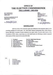 پروفیسر ڈاکٹر ملک شاہد شوکت پاکستان میڈیکل ایسوسی ایشن لاہور کے بلا مقابلہ صدر منتخب،الیکشن کمشنر ڈاکٹر طاہر خلیل کے مطابق پی ایم اے لاہور کے الیکشن کے لیے کاغذات نامزدگی داخل کرانے کا آج آخری دن تھا اور پروفیسر ڈاکٹر شاہد شوکت کے مقابل صدارتی امیدوار کے لیے کسی دوسرے امیدوار نے کاغذات نامزدگی جمع نہیں کرائے اور پروفیسر شاہد شوکت بلا مقابلہ صدر منتخب ہوگئے ہیں جبکہ ان کے ساتھ نائب صدر(مرد)ڈاکٹراحمد نعیم اختر،