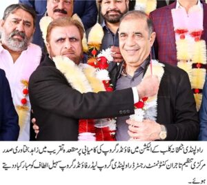 راولپنڈی جم خانہ کلب کے الیکشن میں فاؤنڈر گروپ کی کامیابی پر منعقدہ تقریب میں زاہد بختاوری صدر مرکزی تنظیم تاجران کنٹونمنٹ رجسٹرڈ راولپنڈی گروپ لیڈر فاؤنڈر گروپ سہیل الطاف کو مبارکباد دیتے ہوئے