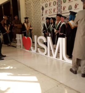 جناح سندھ میڈیکل یونیورسٹی کے چھٹے کاونوکیشن میں ایم بی بی ایس، بی ڈی ایس، ڈاکٹر آف فارمیسی، ماسٹر آف ہبلتھ، بیچلر آف سائنس نرسنگ سمیت مختلف شعبوں کے 505 فارغ التحصل طلبہ وطالبات کو گریجویٹس کی اسناد تفویض کی گئیں۔