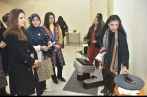 ویمن چیمبر آف کامرس اینڈ انڈسٹری فلاحت عمران لاہور کالج فار ویمن یونیورسٹی میں فرنیچر ڈیزائن ایکسپو میں ایک طالبہ کی تیار کردہ خودکار موبائل چارجنگ ٹیبل کا معائنہ کر رہی ہیں
