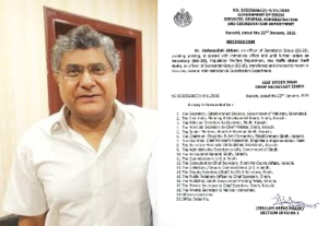 چیف سیکرٹری سندھ آصف حیدر شاہ کی منظوری سے صوبائی سیکرٹری پاپولیشن ویلفیئر ڈیپارٹمنٹ حافظ عبدالہادی بلو کو فوری طور پر ان کے عہدے سے ہٹا دیا گیا ہے اور انہیں محکمہ سروسز میں رپورٹ کرنے کی ہدایت کی گئی ہے اور ان کی جگہ ماضی میں نیب کے ہاتھوں گرفتار ہونے والے حفیظ اللہ عباسی کو سیگریٹری پاپولیشن ویلفیئر ڈیپارٹمنٹ تعینات کیا گیا ہے تعیناتی کا نوٹیفکیشن غلام عباس ملک سیکشن افسر ون کے دستخط سے جاری کر دیا گیا ہے حفیظ اللہ عباسی سیکرٹیریٹ گروپ گریڈ 20 کے افسر ہیں اور ماضی میں مختلف اہم سرکاری عہدوں پر فرائض انجام دے چکے ہیں ۔ دوسری طرف حافظ عبدالحادی بلو