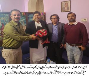ترجمان بلوچستان حکومت شاہد رند بدھ کو کراچی پریس کلب گئے جہاں انہوں نے نو منتخب صدر فاضل جمیلی جنرل سیکرٹری محمد سہیل و دیگر عہدیداروں سے ملاقات کی اس موقع پر انہوں نے ڈیموکریٹس پینل کو انتخابات میں شاندار کامیابی پر مبارکباد پیش کرتے ہوئے وزیر اعلیٰ بلوچستان میر سرفراز بگٹی کی جانب سے پھولوں کا گلدستہ پیش کیا اور نیک خواہشات کا اظہار کیا شاہد رند نے کہا کہ بلوچستان حکومت آزادی صحافت اور صحافیوں کے حقوق کے تحفظ کے لیے ہمیشہ پرعزم رہی ہے کراچی پریس کلب صحافتی اقدار کے فروغ میں اہم کردار ادا کر رہا ہے اور امید ہے کہ نو منتخب قیادت ان اقدار کو مزید مضبوط کرے گی کراچی پریس کلب کے صدر فاضل جمیلی جنرل سیکرٹری محمد سہیل و دیگر عہدیداروں نے کراچی پریس کلب آمد پر ترجمان بلوچستان حکومت شاہد رند کا شکریہ ادا کیا اور دونوں صوبوں کے درمیان صحافتی رابطوں کو فروغ دینے کی ضرورت پر زور دیا ملاقات کے دوران صحافت، آزادی اظہار، اور دونوں صوبوں کے مابین ہم آہنگی کے مختلف پہلوؤں پر تبادلہ خیال کیا گیا ترجمان صوبائی حکومت شاہد رند نے کہا کہ بلوچستان حکومت صحافیوں کے حقوق کے تحفظ اور میڈیا کی آزادی کے فروغ کے لیے اپنی ذمہ داریوں کو خوش اسلوبی سے نبھاتی رہے گی