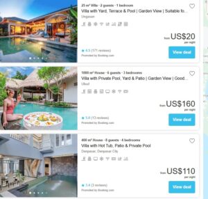 دنیا بھر میں شہرت پانے والے بالی کے مشہور لگزری ولاز سیاحوں کی دلچسپی کا محور بنے ہوئے ہیں کیونکہ یہاں پر جدید سہولتیں ہیں سکون ہے خوبصورتی ہے چھٹیاں گزارنے کی خاطر مختلف علاقوں کی سیر کے لیے نکلنے والوں کے لیے بالی کے یہ لگزری ولاز بہت پرکشش مانے جاتے ہیں سکون اور ارام کے متلاشی سیاح یہاں ضرور آتے ہیں بلکہ بار بار آنا چاہتے ہیں یہاں مختلف سہولتوں اور مختلف جگہوں کے لحاظ سے کرایہ رکھا گیا ہے