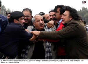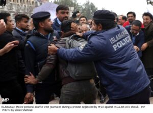 پولیس نے پی ایف یو جے کے صدر افضل بٹ کو روکنے اور حراست میں لینے کی کوشش کی، مظاہرین سے خطاب میں افضل بٹ نے کہا کہ ہم رولز کے خلاف نہیں ہیں لیکن ہم آزادی صحافت پر حملے کی کسی کو اجازت نہیں دیں گے۔