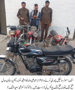اٹک(مہتاب منیر خان سے) ماہر موٹر سائیکل چور گرفتار، چوری شدہ 4 موٹر سائیکل برآمد، تفصیلات کے مطابق تھانہ فتح جنگ کی حدود میں موٹر سائیکل چوری کی وارداتوں پر ڈی پی او سردار غیاث گل خان نے ایس ایچ او فتح جنگ سب انسپکٹر نیاز احمد کے زیر نگرانی خصوصی ٹیم تشکیل دے کر ملزمان کی گرفتاری کے احکامات دئیے جس پر تھانہ فتح جنگ پولیس نے جدید ٹیکنالوجی کو بروئے کار لا کرماہر موٹر سائیکل چور احمد علی ولد غلام محمد سکنہ رحیم یار خان حال فتح جنگ کو گرفتار کر کے دوران تفتیش ملزم کے انکشاف پر4 چوری شدہ موٹر سائیکل برآمد کر لیے گئے۔
