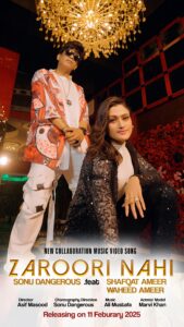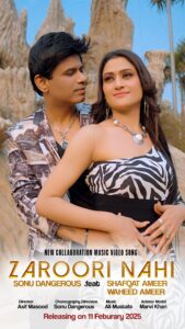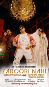 معروف گلوکار و پرفارمرسونو ڈینجرس کا نیا ویڈیو سونگ”ضروری نہیں“ کا پوسٹر ٹیزر جاری کردیا گیا جبکہ یہ گانارواں ماہ 11فروری کو پاکستا ن سمیت دنیا بھر میں ریلیز کیا جائے گا نامور میوزک ڈائریکٹر علی مصطفی نے اس کا میوزک ترتیب دیا جبکہ ہدایتکار آصف مسعود نے ویڈیو کو ڈائریکٹ کیا ہے ”ضروری نہیں “ سونگ میں “ میں ماڈل واداکارہ ماروی خان بھی جلوا گر ہونگی جبکہ گلوکار سونو ڈینجرس کے ساتھ گلوکار شفقت امیر اور وحید امیر بھی اپنی آواز کا جادو جاگئیں گے اس ویڈیو کو سونو ڈینجرس نے کمپوز اور پروڈیوس کیا ہے جبکہ ایس ڈی انٹرٹینمٹ کے پلیٹ فارم سے اس کو پاکستان سمیت دنیا بھر میں ریلیز کیا جارہا ہے جس کی تیاری مکمل کرلی گئی ہے اس حوالے سے نامور گلوکار و ڈانس ڈائریکٹر پرفارمرسونو ڈینجرس نے