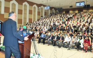 ہم نے اڑان پاکستان کے تحت صحت کے شعبے میں بھی کام جاری رکھا ہے اور مستقبل کے منصوبے کے تحت اگلے تین سالوں میں ہیپاٹائٹس، شوگر، بڑھتی ہوئی آبادی اور دیگر امراض کے تدارک پر کام جاری ہے۔ معزز سٹوڈنٹس آپ لوگ جدید ٹیکنالوجی کے اس دور میں ریسرچ کی طرف دھیان دیں کیونکہ دنیا میں ترقی علم کے پھیلانے سے ملتی ہے، جو قوم سائنس اور ٹیکنالوجی پر عبور حاصل کرے گی دنیا اس کی محتاج ہوگی انہوں نے مزید کہا کہ ٹیکنالوجی کے اس دور میں ہم نے ریسرچ کے میدان میں مہارت حاصل کرنی ہے اور ہمیں نفرت اور تعصب کو چھوڑنا ہوگا یہ انسان کو تباہ کر دیتی ہے، انسان انسانیت کو بھول جاتا ہے۔ دنیا میں کامیاب وہ ہی ہوتا ہے جو مثبت سوچ رکھتا ہے۔