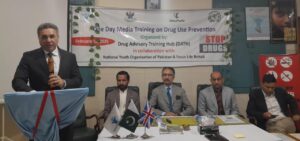 نڈی ایس ریلوے محمد حنیف گل منشیات اور میڈیا کے موضوع پر ایک روزہ تربیتی ورکشاپ کے اختتامی سیشن میں خطاب کررہی ہیں ۔ اسٹیج پر سید ذوالفقار حسین عاطف رضوان سید محسن اور بلال زبیری بیٹھے ہیں ۔