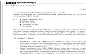 خط میں یہ بھی کہا گیا ہے کہ گھر سے غیر قانونی ہتھیار برآمد ہوئے، اطراف کے رہائشی اپنے گھروں میں محصور رہے، بے امنی اور غیر قانونی سرگرمیوں کے پیشِ نظر رہائشیوں کی حفاظت کو یقینی بنایا جائے، کامران اصغر قریشی کو اس گھر سے نکالا جائے اور اصل مالک کی شناخت کی جائے۔