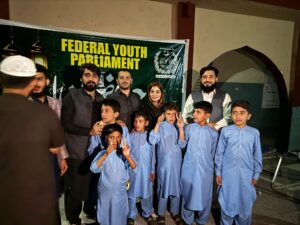 فیڈرل یوتھ پارلیمنٹ کی جانب سے افطاری کے علاؤہ بچوں کی کھانے کی چیزیں ،کھیلنے کی چیزیں ،عیدی اور کپڑے تقسیم کیے گئے۔