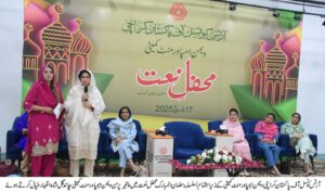 کراچی( )آرٹس کونسل آف پاکستان کراچی ویمن ایمپاورمنٹ کمیٹی کے زیر اہتمام بسلسلہ رمضان المبارک محفل نعت کا انعقادحسینہ معین ہال میں کیا گیا ، محفل نعت میں چئیرپرسن ویمن ایمپاورمنٹ کمیٹی چاند گل شاہ ،ممبر گورننگ باڈی ہما میر ، معروف شاعرہ سبین سیف سمیت خواتین نعت خواہوں کی بڑی تعداد نے شرکت کی ، اس موقع پر چئیرپرسن ویمن ایمپاورمنٹ کمیٹی چاند گل شاہ نے کہا کہ پیارے آقا کی خدمت میں تمام خواتین نے بہت اچھی نعتیں پیش کی ، میں آپ سب کی شکر گزار ہوں کہ آپ سب اس بابر کت محفل میں شریک ہوئے یہاں بہت ہی خوبصورت نعتیں ہماری سماعت کا حصہ بنی ،ان کا مزید کہنا تھا کہ ایسی محافل کے انعقاد سے رمضان کی بابرکت ساعتیں سمیٹنے کا بھر پور موقع ملتا ہے ،محفل نعت میں معروف