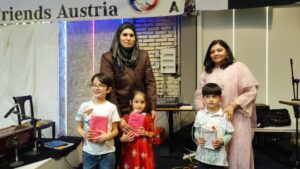 سفیر پاکستان اور سالزبرگ سے ائے ہوئے مہمان چوہدری غلام مصطفی گجر اور ان کی اہلیہ کی جانب سے بچوں میں تحائف تقسیم کیے گئے۔اسٹیج پر کمیونٹی کونسلر شہزاد سلیم کی اہلیہ اور چوہدری غلام مصطفی گجر کی اہلیہ نے تمام بچوں کو تحائف پیش کیے۔