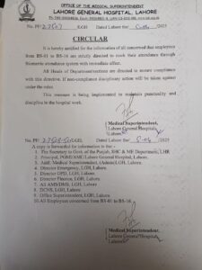 پنجاب حکومت کی پالیسی کے تحت، عوامی توقعات کو پورا کرنے اور مریضوں کی بہتر دیکھ بھال کو یقینی بنانے کے لیے لاہور جنرل اسپتال (ایل جی ایچ) کی انتظامیہ نے گریڈ 16 تک کے ملازمین کے لیے بائیو میٹرک حاضری لازمی قرار دے دی ہے۔