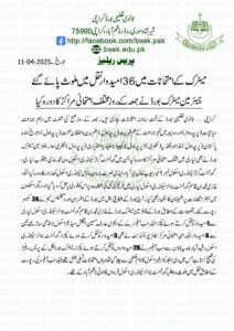کراچی …… ثانوی تعلیمی بورڈ کے تحت سالانہ امتحانات جاری ہیں۔جمعہ کے روز صبح کی شفٹ میں دہم جماعت حیاتیات(پرچہ دوم) اور دوپہر میں نہم جماعت کے علم شہریت(پرچہ اول)، علم بدن و حفظان صحت (پرچہ اول)، تاریخ ہند و پاکستان (پرچہ اول) غذا اور تغذیہ (نظری) (پرچہ اول)، کمپیوٹر اسٹیڈیز اختیاری (پرچہ اول) نظری ہوا۔ چیئرمین میٹرک بورڈ نے بھی لیاری میں مختلف امتحانی مراکزکا دورہ کیاجن میں گورنمنٹ گرلز سیکنڈری اسکول ولی محمد حاجی یعقوب لیا ری، گورنمنٹ گرلز سیکنڈری اسکول نمبر1میر ایوب خان نیا آباد، لیڈی نصرت ہارون ماڈل سیکنڈری اسکول کھارادرکا دورہ کیا جبکہ غازی محمد بن قاسم گورنمنٹ بوائز سیکنڈری اسکول لیاری میں فرنچر کی کمی کی شکایت پر اس کو فوری پرحل کردیا گیا اور دیگر اسکولوں میں بہتر انتظاما ت پر اطمینان کا اظہار بھی کیا۔ آج بورڈ کے شکایتی سیل میں بورڈ کے افسران اور ویجلینس ٹیم نے 36 کیسز رپورٹ کئے۔ تفصیلات کے مطابق بورڈکے چیئرمین میٹرک بورڈ نے غازی محمد بن قاسم گورنمنٹ بوائز سیکنڈری اسکول لیاری سے 1امیدوار کونقل کرتے ہوئے پکڑا جبکہ حب آفیسر نے کے ایم سی عارف حسین انگلش میڈیم اسکول لانڈھی ساڑھے تین سے 6 امیدوار جبکہ اسی امتحانی مرکز سینٹر سپرنٹنڈنٹ نے بھی 3امیدوار کو نقل کرتے ہوئے پکڑا، گورنمنٹ بوائز سیکنڈری اسکول رشید آباد بلدیہ ٹاؤن سے حب آفیسر نے 26 امیدواروں کو نقل کرتے ہوئے پکڑا۔میٹرک بورڈ کل کے پریس ریلیز کی تصحیح کرتا ہے جس میں دی ایجوکیٹر ملیر اسکول کانام غلطی سے چلا گیا تھا وہاں امتحانات تسلی بخش تھے جبکہ حب آفیسر کی رپورٹ کے مطابق نقل میں ملوث وہ طلبہ گورنمنٹ بوائز سیکنڈری اسکول فردوس کالونی ناظم آباد کے تھے۔