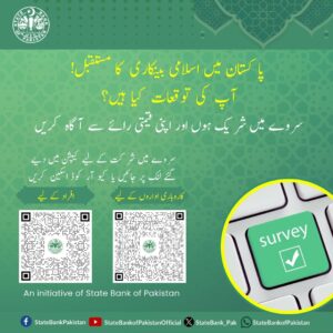پاکستان میں اسلامی بینکاری کے حوالے سے آپ کا تجربہ اور توقعات کیا ہیں؟ اسٹیٹ بینک آف پاکستان، اسلامی بینکاری کے حوالے سے اپنے سروے میں آپ کو شرکت کی دعوت دیتا ہے ۔ سروے میں آپ کی شمولیت پاکستان میں اسلامی بینکاری کے حوالے سے افراد اور کاروباری اداروں کی رائے جاننے میں انتہائی معاون ثابت ہوگی۔