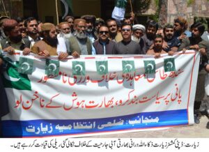 زیارت 28اپریل ۔ ڈسٹرکٹ انتظامیہ زیارت کے زیر اہتمام ڈپٹی کمشنر زیارت ذکاء اللہ درانی کی قیادت میں بھارتی آبی جارحیت کے خلاف ریلی نکالی گئی ریلی میں فوکل پرسن منسٹر فوڈ حاجی نور محمد دمڑ، ڈسٹرکٹ وائس چیرمین حبیب اللہ پانیزئی ڈسٹرکٹ افسران، طلباءاور مختلف مکاتب فکر کے افرد نے شرکت کی ریلی ڈی سی آفس سے شروع ہوکر مختلف شاہراہوں سے ہوتی ہوئی واپس ڈی سی آفس پر اختتام پذیر ہوئی ریلی کے شرکاءنے بھارت اور آبی جارحیت کے خلاف نعرے بازی کی ریلی کے شرکاءسے ڈپٹی کمشنر زیارت ذکاء اللہ درانی نے کہا کہ بھارت کسی بھی قسم کی جارحیت کا بھرپور جواب دیا جائے گابھارت سندھ طاس معاہدے کی خلاف ورزی نہ کریں گر بھارت نے رویہ نہ بدلا تو سخت جواب دینے سے گریز نہیں کرینگے انہوں نے کہا کہ بھارت اپنے رویے میں تبدیلی لائے اور معاہدوں کی خلاف ورزی نہ کریں ورنہ سخت جواب دیا جائے گا انہوں نے کہا کہ بھارت پاکستان پر الزام تراشی بند کریں پاکستانی قوم متحد ہے پاکستان قوم ایک بہادر قوم ہے اور کسی بھی بھارتی جارحیت کو جواب دینے کی صلاحیت رکھتی ہے انہوں نے کہا کہ ملک کی سلامتی دفاع کے لیے کسی بھی قربانی سے دریغ نہیں کیا جائے گا۔