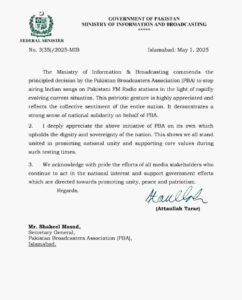 وزارت اطلاعات و نشریات نے پاکستان براڈکاسٹرز ایسوسی ایشن (پی بی اے) کی جانب سے پاکستانی ایف ایم ریڈیو اسٹیشنز پر بھارتی گانوں کی نشریات بند کرنے کے فیصلے کو سراہا ہے۔