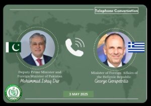 ‎یونان ، 3 مئی 2025 — ڈپٹی پرائم منسٹر و وزیر خارجہ سینیٹر محمد اسحاق ڈار نے یونان کے وزیر خارجہ جارج گیرابیٹریٹس سے ٹیلیفونک گفتگو کی، جس میں دونوں رہنماؤں نے علاقائی اور عالمی امور پر تبادلہ خیال کیا۔