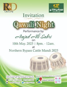 قوالی نائٹ کا اہتمام آج رات 8 بجے آر اینڈ ڈی گروپ کی جانب سے کیا گیا ہے