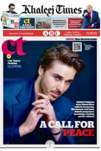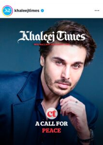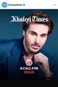 پاکستانی فنکاروں کی امن سے محبت کے پیغام کی دنیا معترف، عالمی جریدے خلیج ٹائمز نے معروف اداکار احسن خان کے پیغام کو سرورق پر شائع کیا