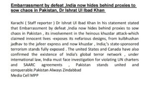شکست سے شرمندہ بھارت اب پاکستان میں افراتفری پھیلانے کے لئے اپنی پراکسیزکے پیچھے چھپ رہا ہے۔۔ خضدار حملے میں معصوم جانوں کی شہادت اسکے مذموم عزائم کو بے نقاب کرتی ہے۔ کلبھوشن یادیو سے لے کر جعفر ایکسپریس اور اب خضدار تک، بھارت کی ریاستی دہشت گردی پوری دنیا پر آشکار ہو چکی ہے۔ ڈاکٹر عشرت العباد خان