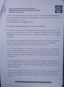 افواجِ پاکستان کے سربراہ و تمام ریاستی اداروں کے سربراہان اور پریس کلب کی پریس کانفرنس اور خدائی خدمت گار ماہر قانون ڈاکٹر سید محمود اختر نقوی اور رہائشی بحریہ ٹاؤن کی پریس کانفرنس اور ہمارے ساتھی بحریہ ٹاؤن ریزیڈنس کمیٹی کے صابق جنرل سیکٹری جناب یوسف طارق صاحب کی حقائق پر مبنی درخواست اور ریزیڈنس کمیٹی کے صدر جناب عامر مجید صاحب کی دی ہوئی درخواست اس تحریر کے ساتھ منسلک ہے جناب ڈپٹی کمشنر ڈسٹرک ملیر جناب ابڑو صاحب نے بحریہ ٹاؤن انتظامیہ کے سینئر جنرل منیجر Facilitation center Maitenance Department Bahria Town Karachi کو حکم دیا کہ تمام بجلی کی کنکشن اور پانی کے کنکشن جو کہ بحریہ ٹاؤن نے غیر قانونی طور پر کاٹے ہیں فورا بحال کئے جائیں اور جناب ڈپٹی کمشنر ملیر کو تعمیل حکم کی رپوٹ دی جائے اس حکم نامے کی کاپی جناب SSP POLICE ڈسٹرک ملیر اور اسسٹنٹ کمشنر سب ڈویژن گڈاب ٹاؤن ڈسٹرک ملیر اور جناب یوسف طارق صاحب کو انفامیشن کاپی ارصال کی ہے تاکہ جناب ڈپٹی کمشنر ڈسٹرک ملیر کے حکم کی تعمیل کرائی جائے تاکہ متاثرین بجلی او پانی کے کنکشن کو فوری طور پر بحال کیا جائے جس کے لئے ہم شکر گزار ہیں