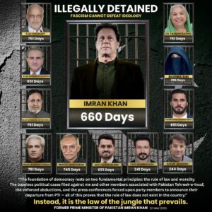 اسلام آباد: پاکستان تحریک انصاف (پی ٹی آئی) نے الزام لگایا ہے کہ پارٹی چیئرمین اور سابق وزیراعظم عمران خان کو گزشتہ 660 دنوں سے غیرقانونی طور پر جیل میں رکھا گیا ہے۔ پی ٹی آئی کے ترجمان نے جمعرات کو میڈیا سے بات کرتے ہوئے کہا کہ عمران خان کے خلاف تمام مقدمات “سیاسی انتقام” کا حصہ ہیں اور انہیں بے گناہ ہونے کے باوجود مسلسل حراست میں رکھا جا رہا ہے۔