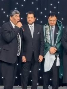 شفقت محمود لندن میں فرزند پاکستان کا ایوارڈ وصولُ کرتے ہوئے منتظم ذولفقار علی بھٹو اور صدر تقریب اداکار شاہد کے ہمراہ