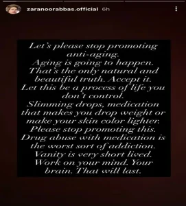 انہوں نے اپنی پوسٹ میں لکھا کہ اینٹی ایجنگ پراڈکٹس کو بڑھاوا دینا بند کریں، عمر کا بڑھنا ایک قدرتی عمل ہے جسے روکنے کی کوشش فضول ہے۔ اس کے بجائے وزن کم کرنے والی دواؤں، سلمنگ ڈراپس یا رنگ گورا کرنے والی ادویات کے جھانسے میں نہ آئیں۔ انہوں نے کہا کہ وقتی خوبصورتی کی نسبت اصل خوبصورتی انسان کی سوچ اور ذہن ہے جو ہمیشہ آپ کے ساتھ رہتا ہے۔