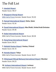 یہ درجہ بندی ہر سال لاکھوں قارئین کی رائے اور ووٹ کی بنیاد پر کی جاتی ہے، جس میں ہوائی اڈے کی رسائی، سیکیورٹی، چیک اِن، کھانے پینے کی سہولتیں، خریداری کے مواقع، اور ڈیزائن جیسے کئی شعبوں کا جائزہ لیا جاتا ہے۔