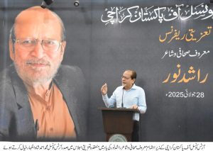 کراچی () آرٹس کونسل آف پاکستان کراچی کے زیرِ اہتمام معروف صحافی و شاعر راشد نور کی یاد میں تعزیتی اجلاس کا انعقاد حسینہ معین ہال میں کیاگیا، تعزیتی اجلاس سے صدر آرٹس کونسل محمد احمد شاہ، شاہد نور، کراچی پریس کلب کے صدر فاضل جمیلی، مزدور رہنما منظور رضی، صحافی و شاعر اے ایچ خانزادہ، ادبی کمیٹی (شعروسخن) کی چیئرپرسن عنبریں حسیب عنبر، رخسانہ صبا، خالد معین اور ریحانہ روحی نے اظہارِ خیال کیا جبکہ نظامت کے فرائض شکیل خان نے انجام دیے، اجلاس میں اسپیشل ایونٹ کمیٹی کے چیئرمین اقبال لطیف، ڈاکٹر عالیہ امام، صحافی اطہر جاوید صوفی، ذیشان صدیقی سمیت مختلف شعبہ ہائے زندگی سے تعلق رکھنے والی شخصیات نے بڑی تعداد میں شرکت کی۔ تقریب کا آغاز راشد نور کی زندگی پر بنائی گئی دستاویزی فلم سے کیاگیا، اس موقع پر صدر آرٹس کونسل محمد احمد شاہ نے گفتگو کرتے ہوئے کہاکہ میں یہ سمجھتا ہوں کہ آج بہت تکلیف دہ وقت ہے، راشد نور ہم سب کے عزیز دوست تھے، ان کے اعزاز میں کراچی، لاہور اور اسلام آباد میں تقریبات ہوئیں، راشد نور کی کتاب کی تیاری پر کام چل رہا ہے، آرٹس کونسل آف پاکستان کراچی کتاب مکمل ہونے پر شائع اور رونمائی کرے گی۔ راشد نور جلدی جلدی سب کام کر کے چلے گئے۔ مزدور رہنما منظور رضی نے کہاکہ راشد نور بہت عظیم انسان تھے، وہ ہر ایک سے مخلص رہے۔ شاہد نور نے اظہارِ خیال کرتے ہوئے کہاکہ راشد نور روزنامہ ”نوائے وقت“ اور ”نئی روشنی“ میں لکھا کرتے تھے، انہوں نے صحافت اور شاعری میں بڑا نام کمایا، کچھ لوگوں کی جدائی ایسی ہوتی ہے جو دل سے نہیں جاتی راشد نور بھی ان میں سے ایک تھے، میں صدر آرٹس کونسل محمد احمد سمیت آپ سب کا مشکور ہوں جنہوں نے میرے بھائی کو یاد رکھا۔ صدر کراچی پریس کلب فاضل جمیلی نے کہاکہ راشد نور کے جانے کا صدمہ برداشت نہیں کرپا رہا جب اس بارے میں سوچتا ہوں گہرے صدمے میں چلا جاتا ہوں، راشد سے میرا تعلق صحافتی اور ادبی تھا، میری ان سے گفتگو اور بے تکلفی کبھی ختم نہیں ہوئی، انہوں نے امریکہ جانے سے قبل مجھے میسج پر کہا کہ اب میں کسی تقریب میں نہیں جاﺅں گا، قدرت نے انہیں تمام دوستوں سے ملنے کا موقع دیا۔ صحافی و شاعر اے ایچ خانزادہ نے کہاکہ راشد نور نے پوری جرأت کے ساتھ لکھتے اور بولتے تھے، جو کام راشد نے چھوڑا ہے اس کی تکمیل ضروری ہے، ہم راشد کی محبت اور غصے کا شکار رہے، شاعری کے حوالے سے دنیامیں ان کا ایک نام تھا، ہم آرٹس کونسل سے درخواست کرتے ہیں کہ راشد نور کی کتاب کا کام جو مکمل ہو چکا ہے اس کی اشاعت کو یقینی بنائیں۔ ادبی کمیٹی (شعر وسخن) کی چیئرپرسن عنبریں حسیب عنبر نے کہاکہ میرا راشد نور سے احترام کا تعلق تھا اگر میں راشد نور کے اعزاز میں منعقدہ تقریب میں نہ آتی تو آج خود کو معاف نہ کرپاتی، راشد نور نے تمام عمر جدو جہد کی، اب ان کے نام کو زندہ رکھنا ہمارا اخلاقی فرض ہے، راشد نور ہمیشہ دُکھ سُکھ میں ساتھ رہتے، میں اکثر سوچتی تھی کہ ہمیں کون یاد کرے گا مگر محمد احمد شاہ نے یہ احساس دلایا کہ آرٹس کونسل ایک ایسا ادارہ ہے جو ادیبوں اور فنکاروں کو ہمیشہ یاد رکھتا گا، راشد نور نے نئے آنے والوں کو راستہ ہموار کیا، ہم محمد احمد شاہ کے شکر گزار ہیں جنہوں نے راشد نور کی کتاب شائع کرانے کی ذمہ داری لی۔ ادبی کمیٹی (فکشن) کی نائب چیئرپرسن ریحانہ روحی نے کہاکہ راشد نور بہت سادہ انسان تھے، کچھ دن پہلے آرٹس کونسل نے اسی ہال میں راشد نور کے اعزاز میں تقریب رکھی تھی، اس دن راشد نور بہت خوش تھے، شاعر وحید نور نے کہاکہ میں سمجھتا ہوں راشد نور جیسے کرداروں پر کام ہونا چاہیے کتاب میں ان کی خدمات کا ذکر کرنا چاہیے، راشد نور ان لوگوں میں سے تھے جو کراچی کی محفل میں جان ڈال دیتے۔ عابد رشید نے ویڈیو پیغام میں کہاکہ راشد نور کے کلام کو شکاگو میں بہت پذیرائی ملی، ان کا دنیا سے چلے جانا عالم ادب میں بہت بڑا خلا ہے، راشد نور مجسم ،گفتگو اخلاص اور مخلص دوست تھے۔