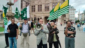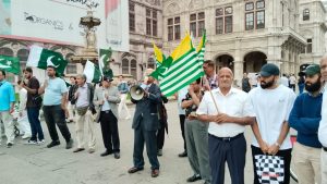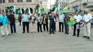 (رپورٹ محمد عامر صدیق ویانا اسٹریا) چیئرمین کشمیر فریڈم فرنٹ آسٹریا پروفیسر مسرت شوکت اعوان کی سربراہی میں بھارتی سفارت خانہ ویانا کے سامنے یوم استحصال کشمیر کے موقع پر احتجاجی مظاہرہ کا انعقاد کیا گیا. بھارت کے ظالمانہ اقدامات کے خلاف اور کشمیری بہن بھائیوں کے ساتھ اظہار یکجہتی کیلئے پاکستانی و کشمیری کمیونٹی انڈین سفارت خانہ کے سامنے بڑی بھرپور تعداد میں جمع ہوئے۔اس موقع پر مظاہرین نے بینرز،کشمیری جھنڈے اور پاکستان جھنڈے اٹھائے ہوئے تھے جس میں نمایاں پیغامات تھے کہ کشمیر میں ظلم و ستم کو ختم کیا جائے۔