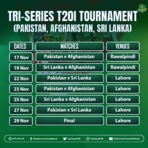 پاکستان پہلی بار ٹی ٹوئنٹی ٹرائی سیریز کی میزبانی کرے گا۔ یہ ٹرائی سیریز 17 تا 29 نومبر راولپنڈی اور لاہور میں ہوگی۔