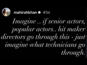 فلم انڈسٹری کے ٹیکنیشنز اور پس پردہ عملے کی مشکلات اجاگر کرتے ہوئے ماہرہ خان نے ان کے حق میں آواز بلند کی۔ تاخیر سے ادائیگیوں کے مسئلے پر فنکار برادری کی جانب سے اٹھنے والی آوازوں میں شامل ہوتے ہوئے ماہرہ نے جمعرات کو اپنی انسٹاگرام اسٹوری میں اس مسئلے کی سنگینی کی یاد دہانی کرائی۔