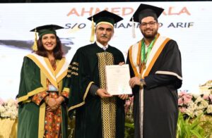 شیخ الجامعہ این ای ڈی ڈاکٹر محمد طفیل اور چئیرپرسن شعبہ کمپیوٹر سائنس ڈاکٹر شہنیلہ زرداری طالب علم کو گولڈ میڈل اور سرٹیفیکٹ دیتےہوۓ