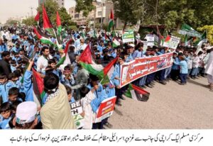 کراچی (۔ ) پاکستان مرکزی مسلم لیگ کراچی کے زیر اہتمام غزہ میں اسرائیلی مظالم کے دو سال مکمل ہونے کے خلاف خواتین اور بچوں کی جانب سے عظیم الشان “غزہ واک” کا انعقاد کیا گیا۔ یہ واک خالد بن ولید روڈ سے شاہراہ قائدین تک نکالی گئی جس میں ہزاروں خواتین اور بچوں نے بھرپور شرکت کی۔ شرکاء نے فلسطینی پرچم، پلے کارڈز اور بینرز اٹھا رکھے تھے اور اسرائیل کے خلاف زوردار نعرے بازی کرتے ہوئے عالمی ضمیر کو جھنجھوڑا۔