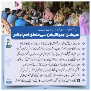 وزیراعلیٰ پنجاب مریم نواز کی زیر صدارت خصوصی تعلیم سے متعلق اہم اجلاس میں 5 ہزار سے زائد خصوصی بچوں کے داخلوں کا ریکارڈ قائم، غریب بچوں کیلئے مفت آٹزم تھراپی و تعلیم، عالمی ماہرین کی خدمات، ہمت کارڈ پروگرام میں شمولیت، 48 نئی بسوں، یونیفارمز اور 13 رکنی بورڈ آف گورنرز کی منظوری دی گئی۔