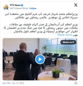 سوشل میڈیا پر گزشتہ دنوں ایک دعویٰ گردش کرتا رہا کہ وزیرِاعظم پاکستان شہباز شریف نے اسرائیلی وزیرِاعظم بن یامین نیتن یاہو سے مصر میں ہونے والی امن کانفرنس کے دوران ملاقات کی۔
