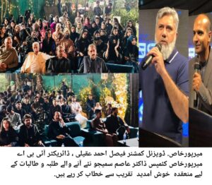 ڈویزنل کمشنر فیصل احمد عقیلی نے کہا ہے سکھر آئی بی اے یونیورسٹی سب کئمپس میرپورخاص ایک قابل اعتماد ادارہ ہے جو نوجوانوں کے بہتر اور روشن مستقبل کے لیے کوشاں ہے. یہ بات انہوں نے سکھر آئی بی اے یونیورسٹی سب کئمپس میرپور خاص میں نئے آنے والے طلبہ و طالبات کو خوش آمدید کرنے کے تقریب فریشر میوزیکل نائٹ 2025 میں خطاب کرتے ہوئے کہی. انہوں نے مزید کہا کہ یہ ادارہ نوجوانوں کے روشن مستقبل کے لیے کام کر رہا ہے اور اس؛ ادارے میں رہ کر نوجوان اپنے معیار تعلیم کو بہتر بنا سکتے ہیں بلکہ جب وہ یہاں سے اپنی تعلیم مکمل کرکے روزگار کی خاطر دیگر اداروں میں جائیں گے تو وہ ان کی قابلیت پر فخر کریں گے اس موقع پر ڈائریکٹر آئی بی اے میرپورخاص کئمپس ڈاکٹر عاصم سمیجو نے خطاب کرتے ہوئے کہا کہ سکھر آئی بی اے یونیورسٹی سب کئمپس میرپور خاص کمیونٹی سے جڑا ہوا ادارہ ہے اور کوشش کر رہا ہے کہ کمیونٹی سے جڑے ہوئے مسائل کو حل کرنے کے لیے مقامی لوگوں کی مدد کی جائے اور جدید ٹیکنالوجی کو استعمال کرکے زرعی شعبے میں اصلاحات لاکر جی ڈی پی گروتھ میں بہتری لانا ہے. قبل ازیں مختلف سبجیکٹس کے سالانہ امتحانات میں نمایاں کارکردگی پیش کرنے والے طلبہ و طالبات اور اساتذہ اور کئمپس انتظامیہ میں سرٹیفیکیٹس تقسیم کی گئیں. اس موقع پر طلبہ و طالبات نے سندھی، اردو اور انگلش زبان میں گیت بھی پیش گئے اس موقع پر اسٹنٹ کمشنر تعلقہ حسین بخش مری سعود بن نعمان، سندھ ہائی کورٹ بار ایسوسی ایشن صدر میر پرویز ٹالپر ، سابق صدر علی حسن چانڈیو، پرنسپل پبلک اسکول پروفیسر عمران لاڑک ، عبدالناصر خان, ڈی ایس پی سیٹلائیٹ ٹاؤن محمد اسلم جاگیرانی،فیکلٹی ممبران ،طلبہ و طالبات بڑی تعداد میں موجود تھے.
