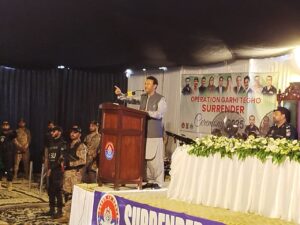 ڈی آئی جی لاڑکانہ ناصر آفتاب پٹھان کی جانب سے سرینڈر تقریب میں اعداد و شمار پیش کرتے ہوئے بتایا گہ ڈاکوؤں کے خلاف گرینڈ آپریشن ستمبر 2024 میں شروع ہوا جس کا مقصد خطے سے ڈاکوؤں کو ختم کرنا اور علاقے کو اسلحے سے پاک۔کرنا تھا