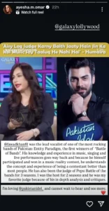 اداکارہ عائشہ عمر نے انسٹاگرام پر فواد خان کی حمایت کرتے ہوئے لکھا کہ وہ پاکستان کے مشہور راک بینڈ ای پی (Entity Paradigm) کے مرکزی گلوکار رہ چکے ہیں، جو بیٹل آف دی بینڈز کے پہلے فاتح تھے۔ ان کے مطابق فواد خان کا موسیقی میں طویل تجربہ ہے، اور وہ خود ایک ریئلٹی شو کے فاتح رہ چکے ہیں، اس لیے وہ مقابلے میں شریک نوجوانوں کے احساسات کو بہتر طور پر سمجھتے ہیں۔ انہوں نے یہ بھی یاد دلایا کہ فواد خان تین سیزنز تک ’پیپسی بیٹل آف دی بینڈز‘ کے جج رہ چکے ہیں، اور ان کی تنقید ہمیشہ مدلل اور مؤثر ہوتی تھی۔